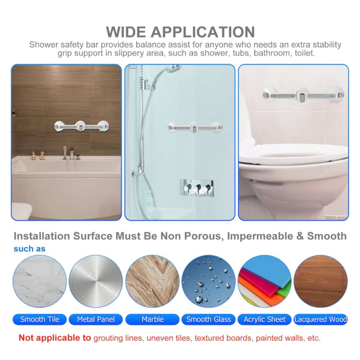 Shower safety bar provides balance assist for anyone who needs an extra stability grip support in slippery areas, such as showers, baths, bathroom and toilet areas.