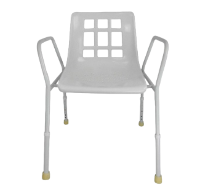 Lightweight yet sturdy, this standard aluminum shower chair offers a safe and comfortable bathing experience. Its rust-resistant frame, adjustable height, and non-slip rubber feet ensure stability and adaptability for any bathroom. Perfect for added support and convenience during showers.
